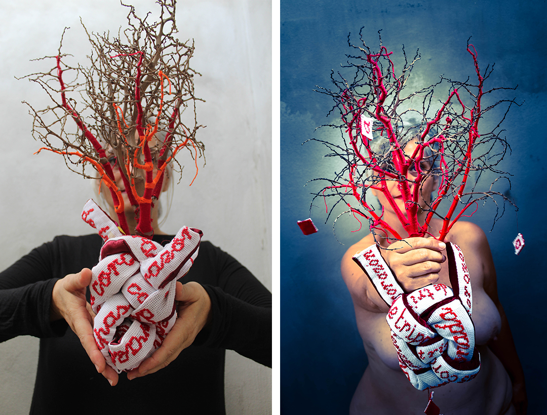 Lo que esas mujeres entendían en convertir el sufrimiento en virtud. De transformar un momento de aflicción en un paso largo y trabajoso para seguir adelante. Una maraña de tejido en la obra de Mercedes Bautistas, donde el mantra bordado en hilo rojo arremete sobre las tripas compuestas en un corazón. Porque de esta pareja energética la artista hace crecer un árbol, en principio enjuto y débil, que manifiesta su poder regenerador mediante el hilo rojo que circunvala su tronco, promesa alimentada con la primera sangre, con el hilo sagrado que une a todas las especies, con el hilo de sangre que revela la palabra elevada al cielo en la que creen las culturas prehispánicas, la cultura adoptiva de Mercedes Bautista.
